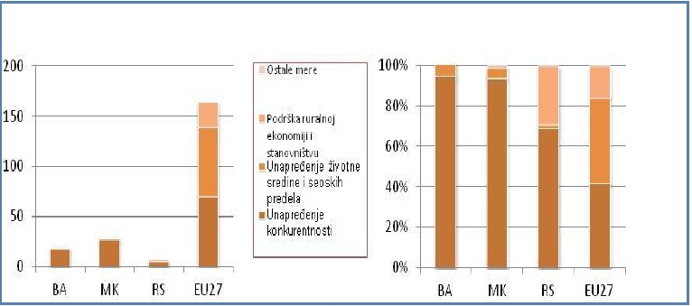 Jedno od najdelikatnijih pitanja za Srbiju je nivo podrške ruralnom razvoju – budžetska izdvajanja u Srbiji po gazdinstvu su hektaru obradivog zemljišta su znatno niža nego u BiH i Makedoniji koje višestruko više izdvajaju za podršku ruralu. Za 2012. godinu za koje postoje podaci za sve tri zemlje podaci su po Srbiju porazni a u 2014. godini su oni i gori.